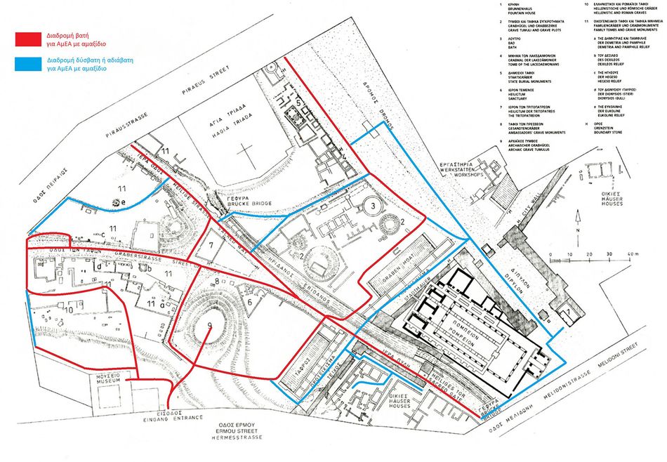 Accessibilité personnes avec handicap et PMR : le site est accessible en grande partie aux visiteurs à mobilité réduite et en fauteuil roulant depuis l’entrée principale au 148 Ermou. Le musée quant à lui est entièrement accessible et dispose de WC adaptés. Plan d’accessibilité (Source : The heart of Ancient Athens.gr).