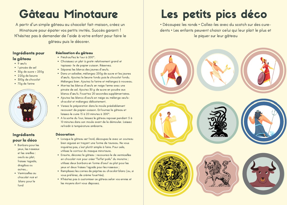 - Un kit déco et jeux : cartons d’anniversaire, marque-places, guirlandes, recette du gâteau Minotaure ainsi que quelques jeux créatifs à réaliser en plus si vous le souhaitez.