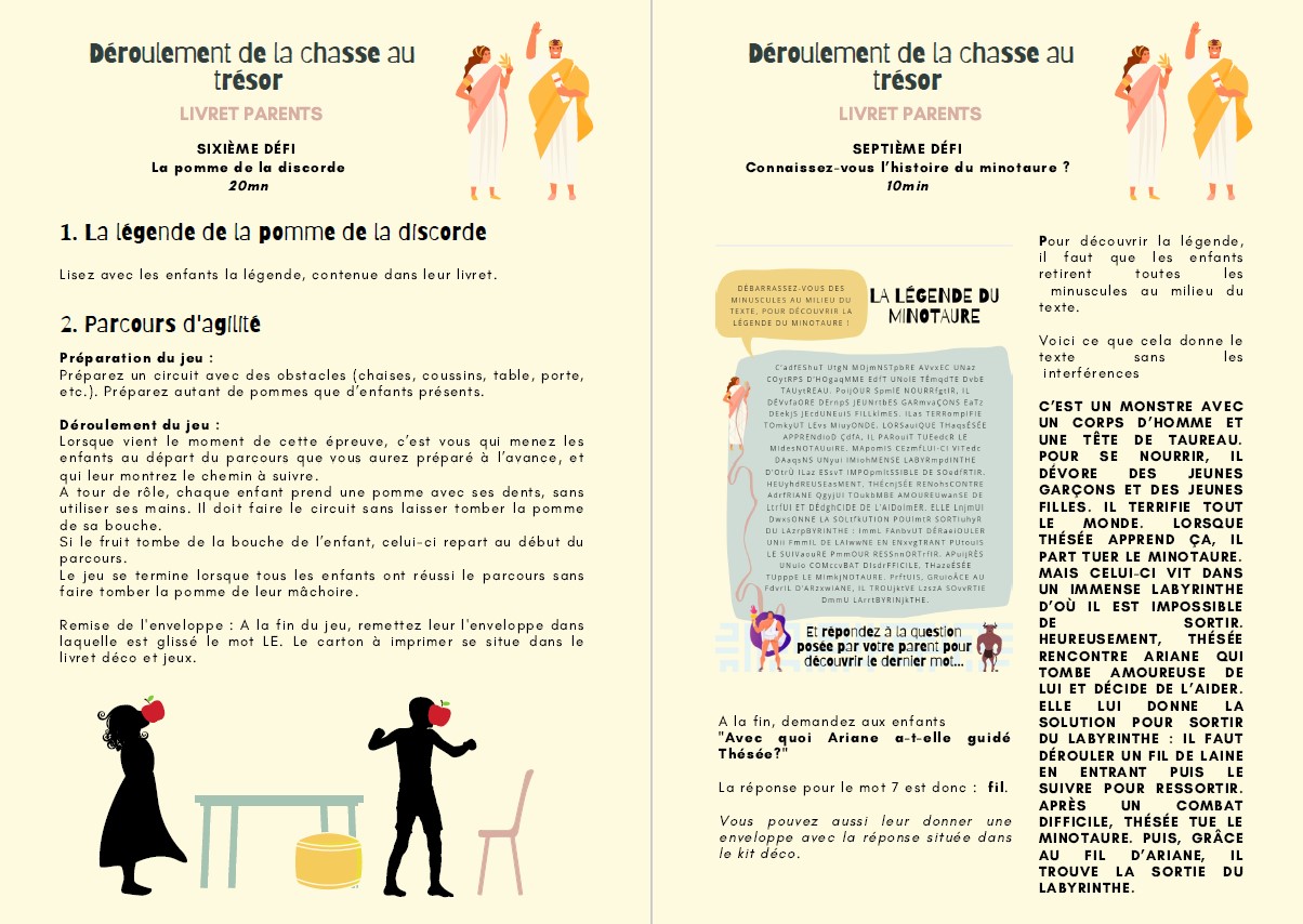 Spécialement conçue pour les anniversaires, cette chasse au trésor passionnera les enfants ! Il s’agit de découvrir « Où se cache le Minotaure?« . Pour cela, les enfants sont aidés par les Dieux et héros grecs…. et ils doivent réaliser 7 défis (énigmes et jeux récréatifs) pour trouver un message.