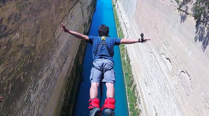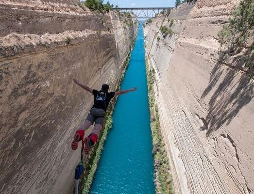 Le saut se fait dans un lieu spectaculaire : le canal de Corinthe. Situé à 1h30 d’Athènes en allant dans le Péloponnèse, le canal de Corinthe est un lieu unique, qui se prête particulièrement bien à cet exercie.