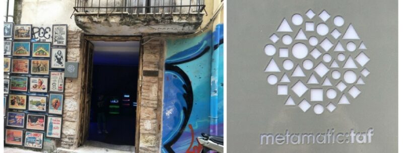 Sans doute êtes vous passés plusieurs fois devant l’entrée de TAF sans même vous en apercevoir. En effet, mieux vaut avoir l’oeil pour déceler ce lieu insolite. Il se trouve au numéro 5 de la rue Normanou, une perpendiculaire à la rue Ermou. Une toute petite porte, surmontée d’un balcon un peu défraîchi et accolé à un vendeur d’antiquités, vous y êtes. Le logo rond, composé d’une multitude de formes géométriques est la seule indication du lieu.