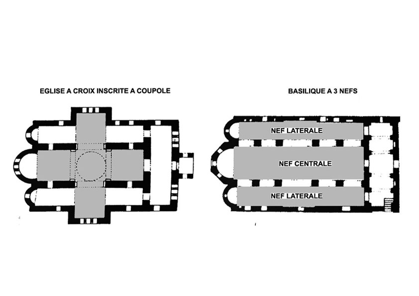 Pour comprendre l’architecture de ces églises, il faut lever les yeux vers le ciel. On y voit une coupole soutenue par 4 colonnes domine le centre de l’église ; à partir de cette coupole centrale partent 4 voûtes demi-cylindriques qui forment la fameuse croix. Dans le centre de la coupole on aperçoit le visage du Christ Pantokrator, c’est à dire du Christ Tout-puissant, sublimé par la lumière des fenêtres qui l’entourent.
